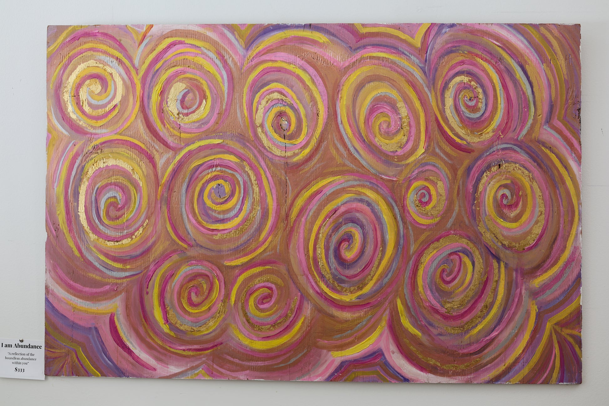 Hand-channeled by visionary artist Melissa, this 2ft x 4ft piece is a joyful transmission of limitless prosperity. Painted on reclaimed plywood in rich pinks, magentas, golds, and cosmic swirl patterns, “I Am Abundance” is designed to elevate the vibration of your space and attune your spirit to the wealth of your own being.